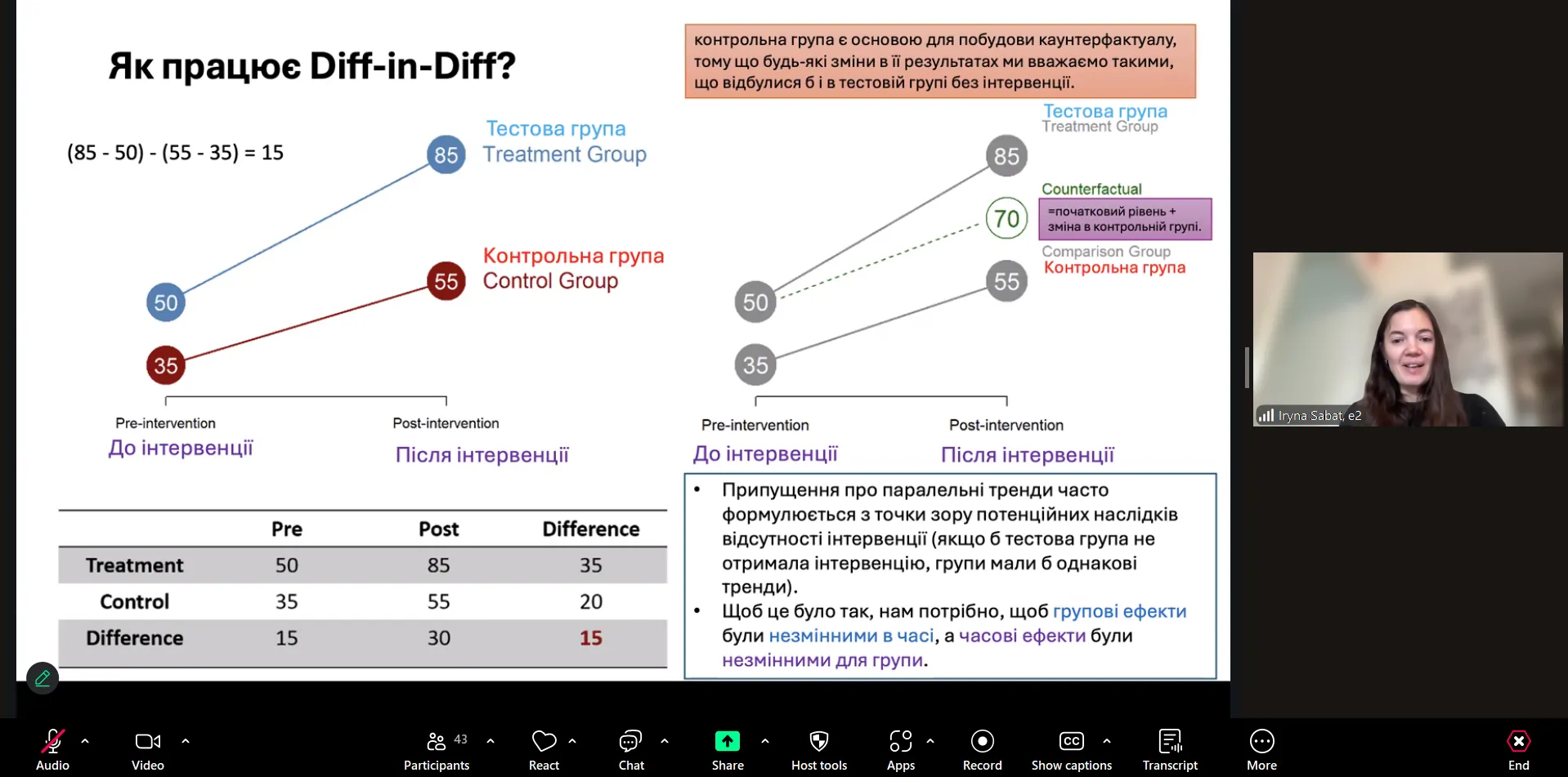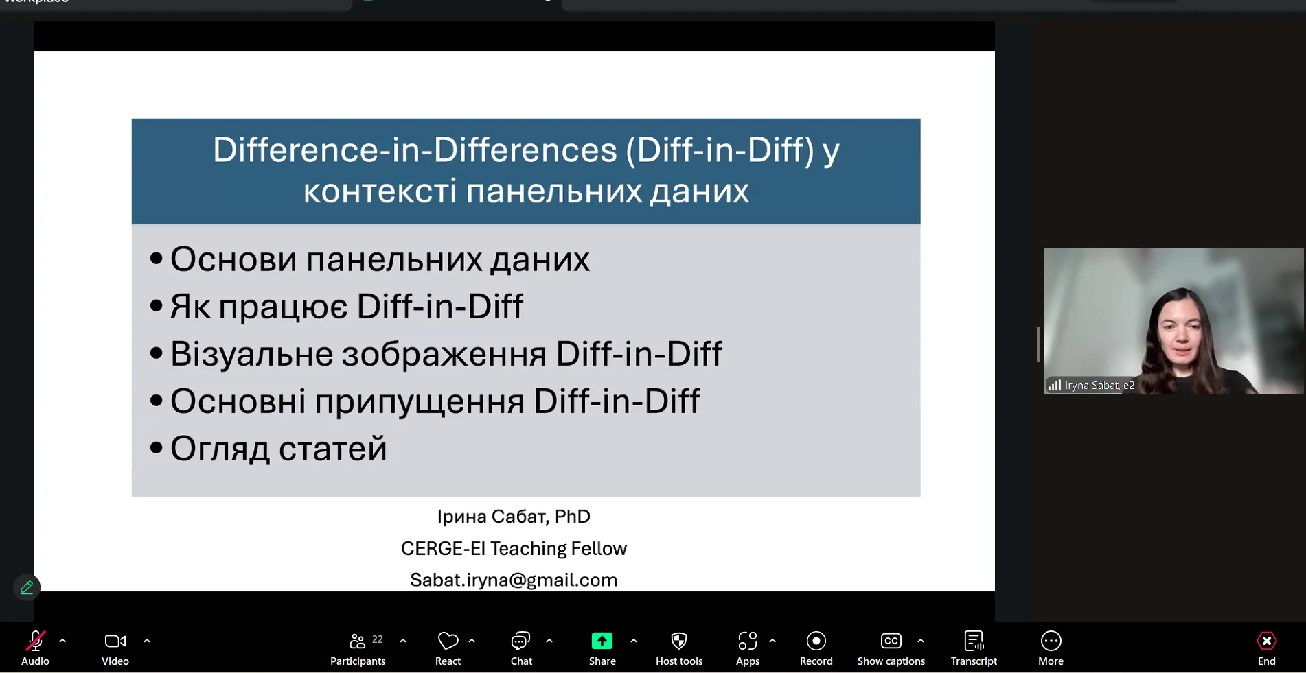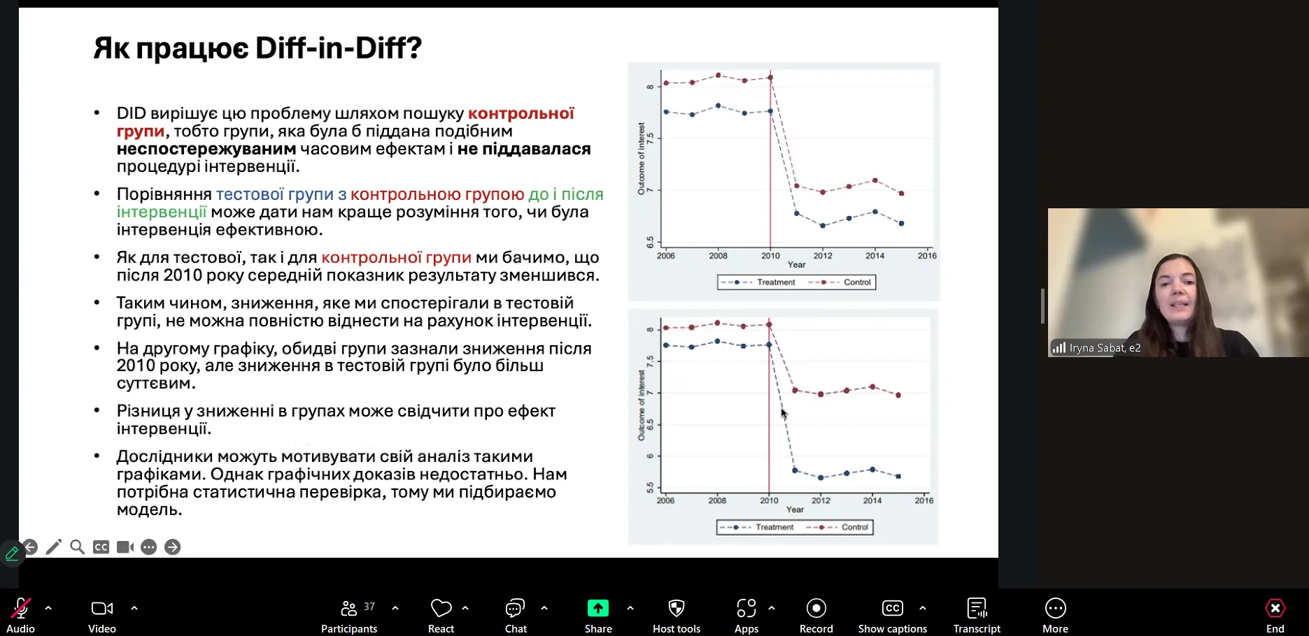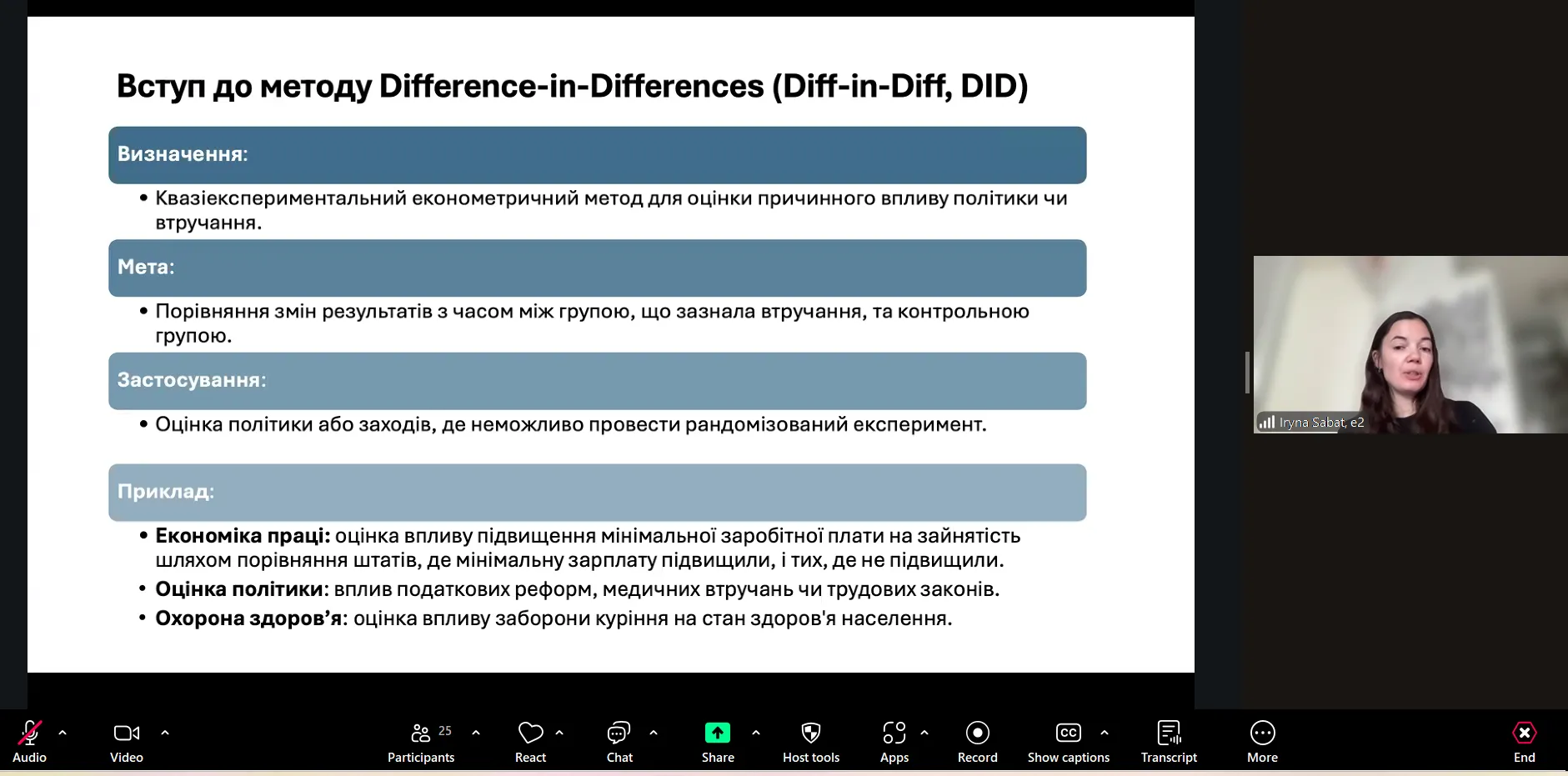Під час лекції «Didderence-in-Difference (Diff-in-Diff) у контексті панельних даних» здобувачі економічного факультету ознайомилися з: