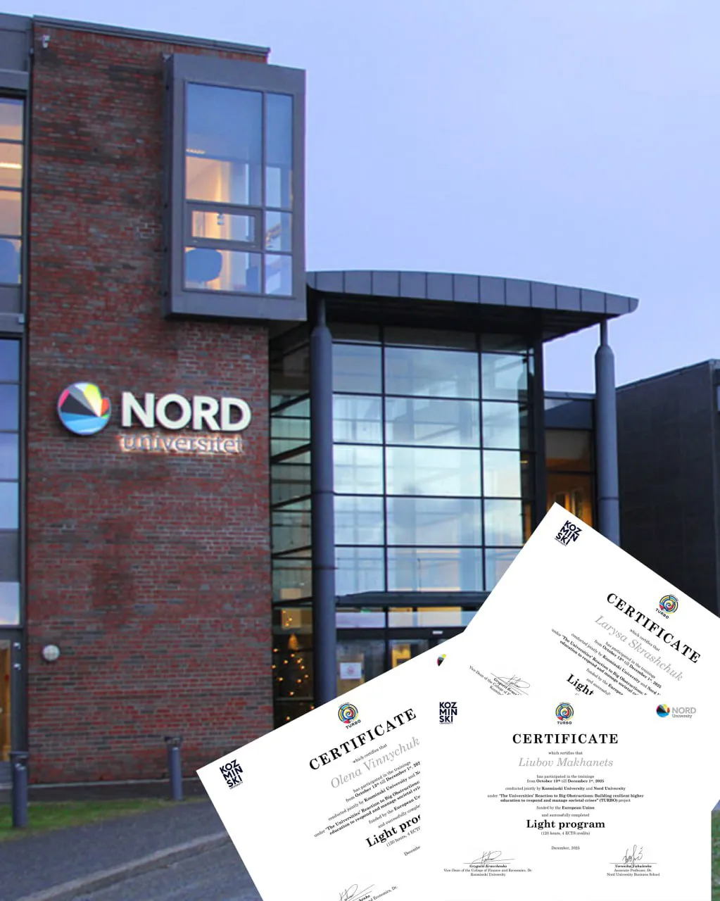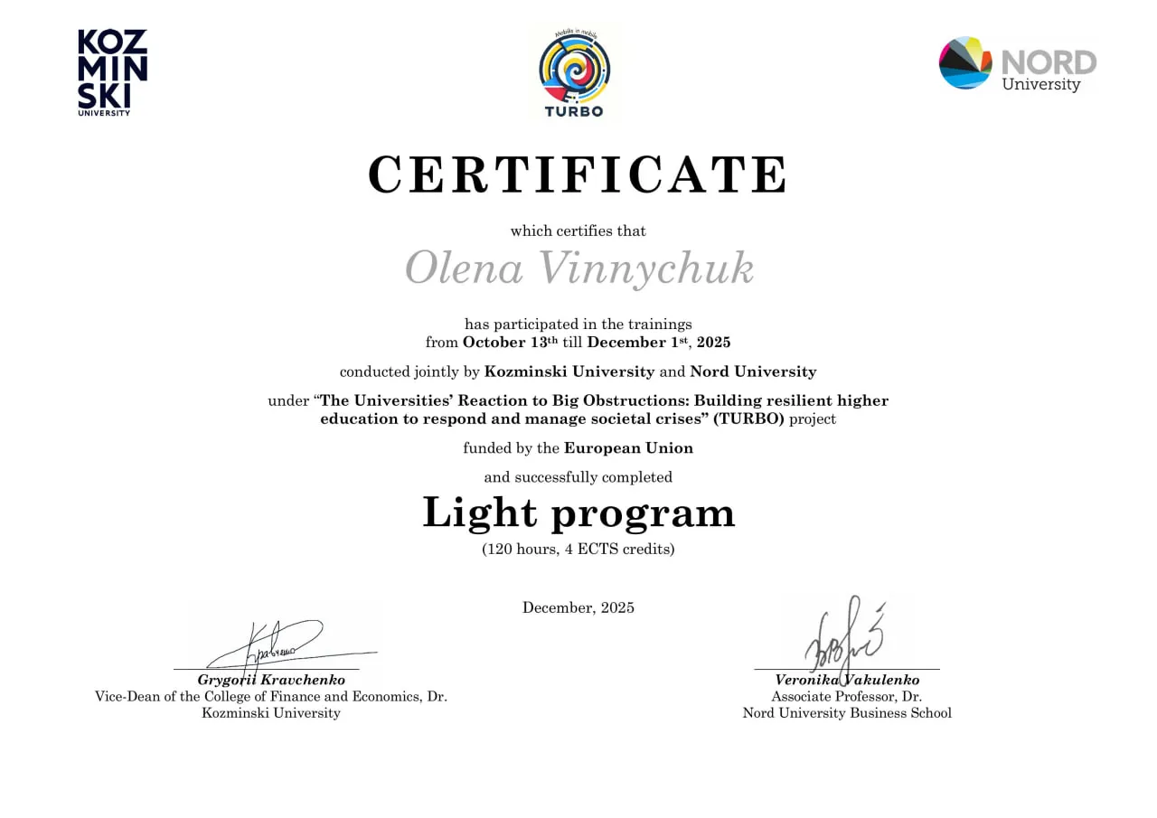 Доценти Олена Вінничук, Любов Маханець та Лариса Скращук пройшли міжнародне стажування в межах проєкту ЄС TURBO – “The Universities’ Reaction to Big Obstructions: Building resilient higher education to respond and manage societal crises”, що реалізується у співпраці Kozminski University (Польща) та Nord University (Норвегія). Програма тривала з 13 жовтня по 1 грудня 2025 року та охоплювала 120 годин (4 ECTS кредити).