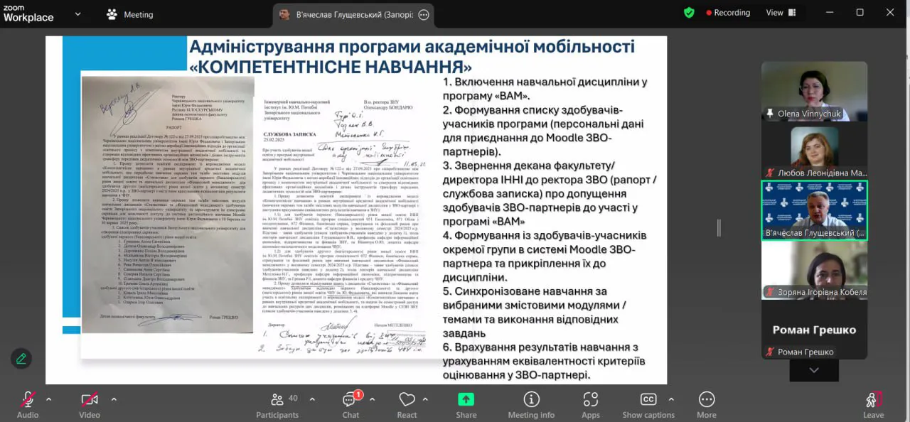 Доцентка кафедри економіко-математичного моделювання Олена Вінничук виступила модераторкою міжуніверситетського науково-методичного семінару, присвяченого внутрішній академічній мобільності між ЧНУ ім. Ю. Федьковича та ІННІ ім. Ю.М. Потебні. Разом із професором ІННІ В'ячеславом Глущевським, автором програми «ВАМ», вона координувала обговорення досвіду, проблем, позитивних практик і перспектив цього проєкту.