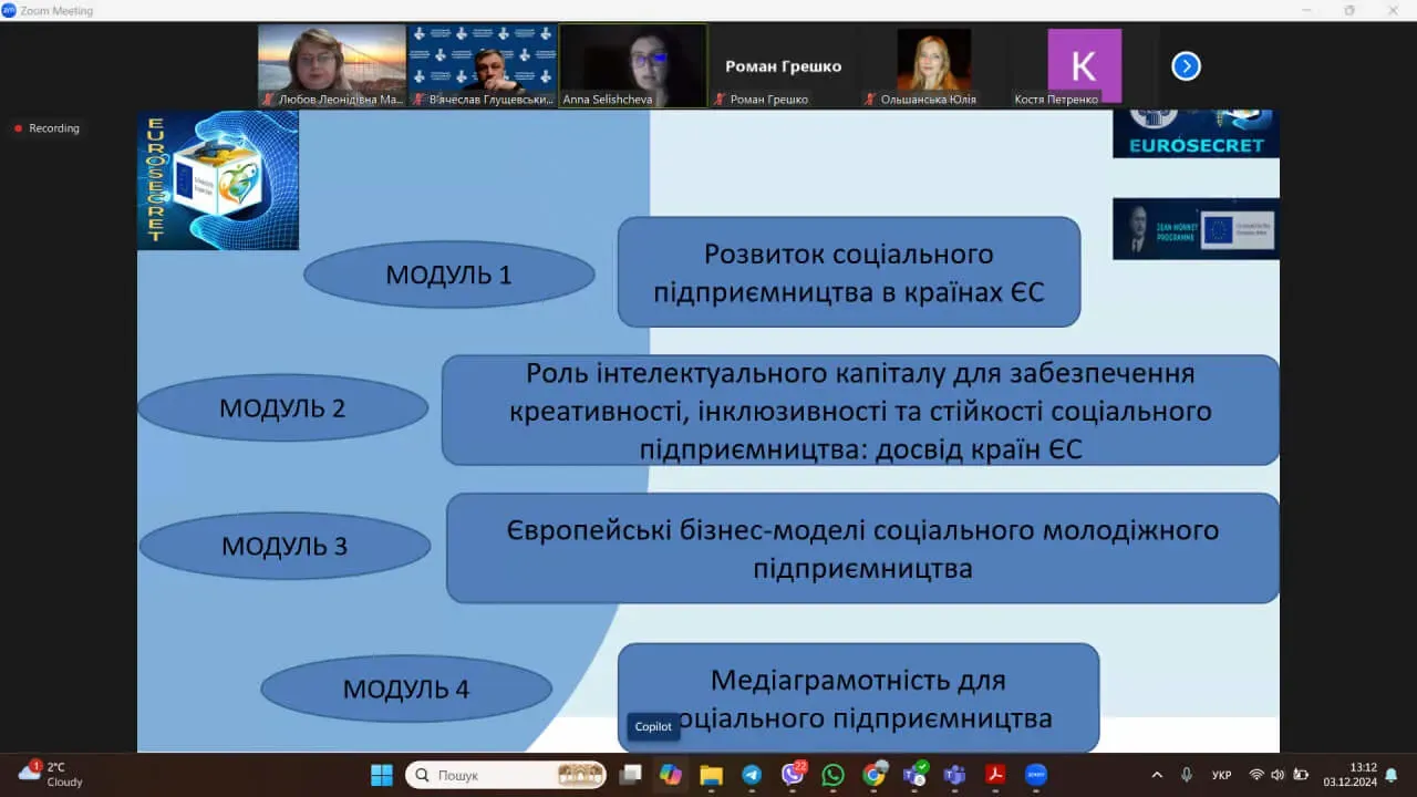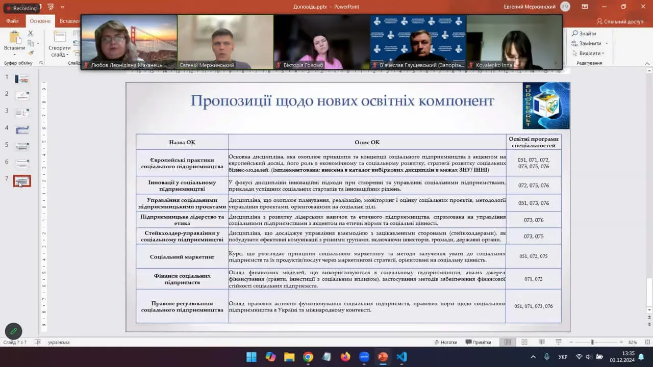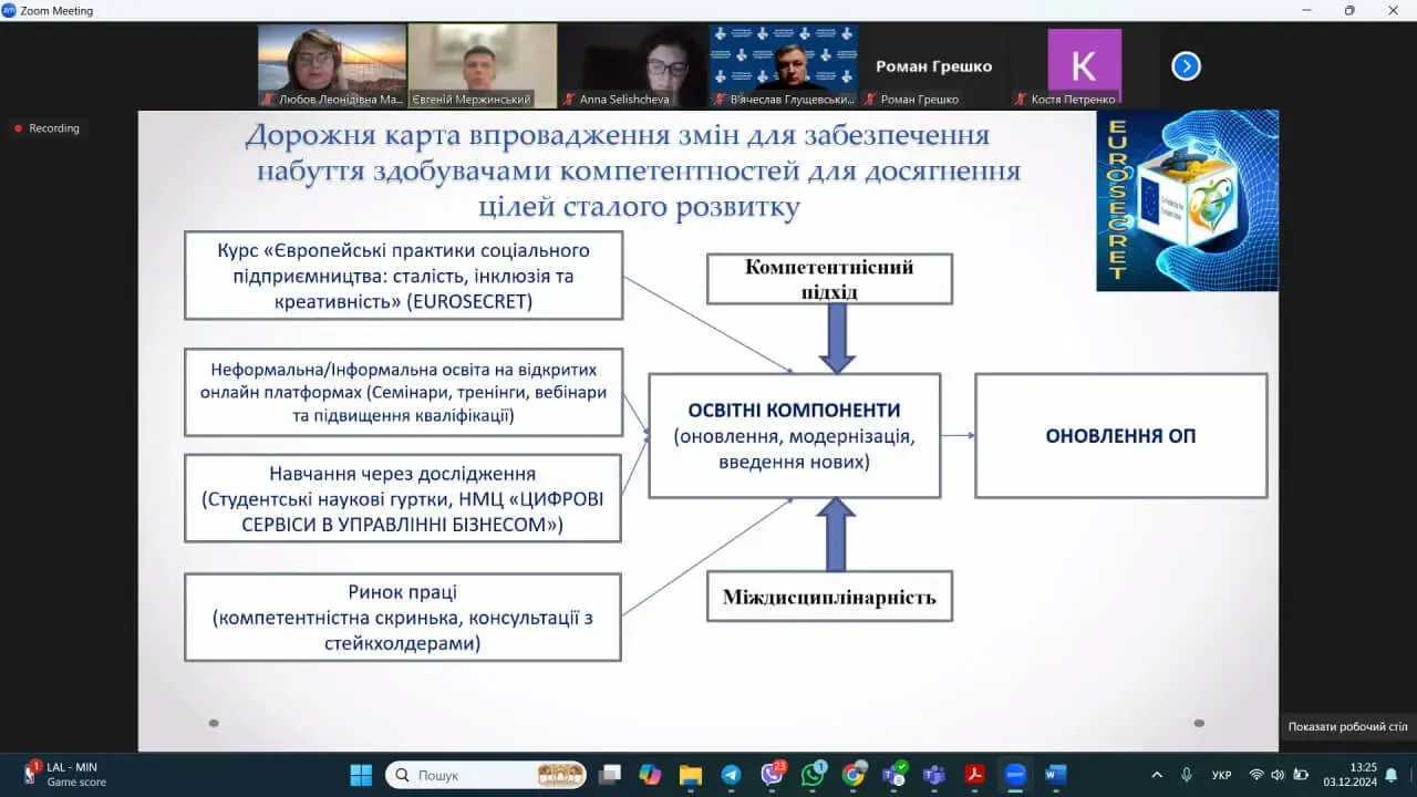 Під час заходу учасники обговорили оновлення структури освітніх програм до 2025 року, інтеграцію концепції сталого розвитку в навчальні курси та впровадження нових міждисциплінарних дисциплін. Особливо було представлено курс “Європейські практики соціального підприємництва” (EUROSECRET) .