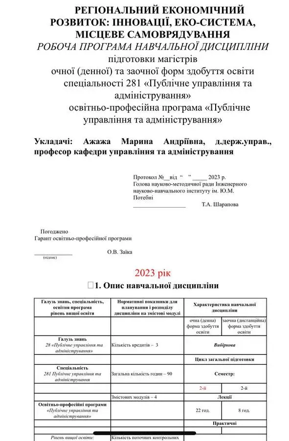 Вікторія вивчала дисципліну "Регіональний економічний розвиток: інновації, еко-система, місцеве самоврядування" під керівництвом викладача Ажажи Марини Андріївни.